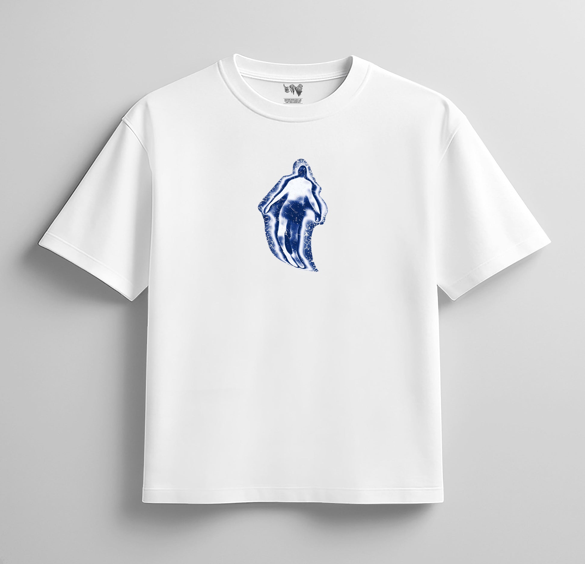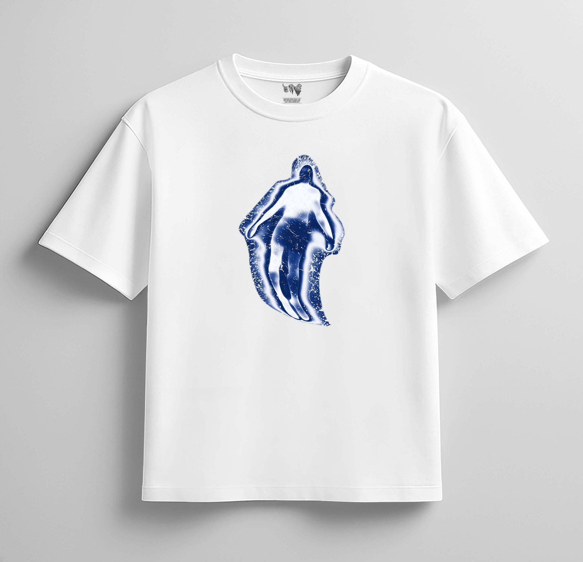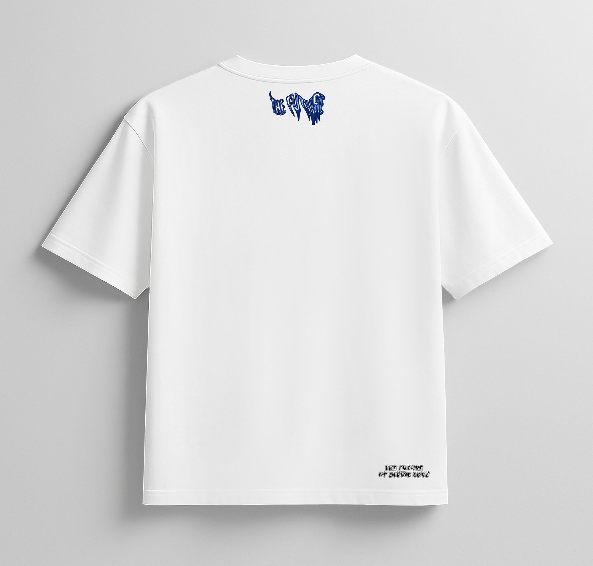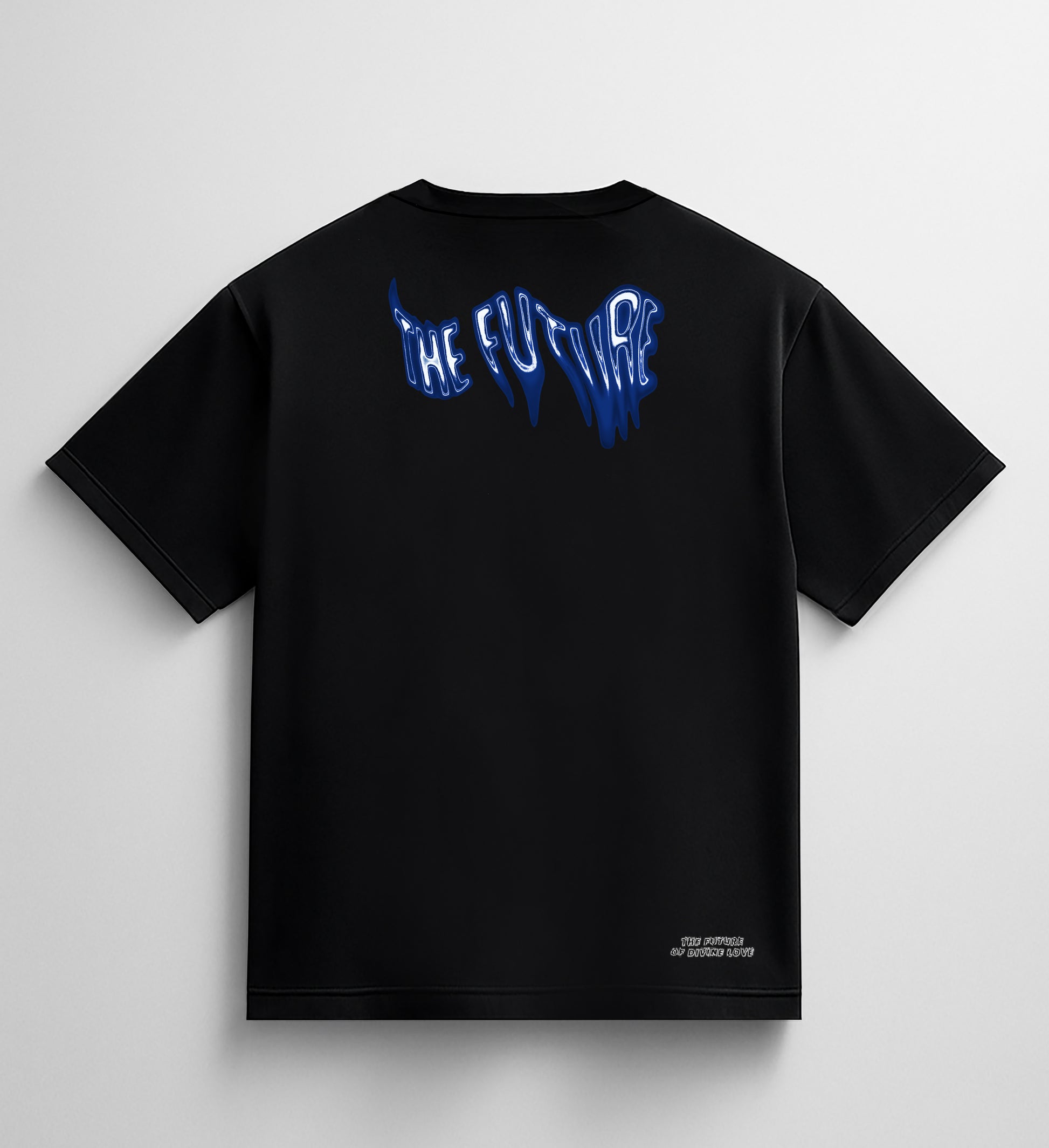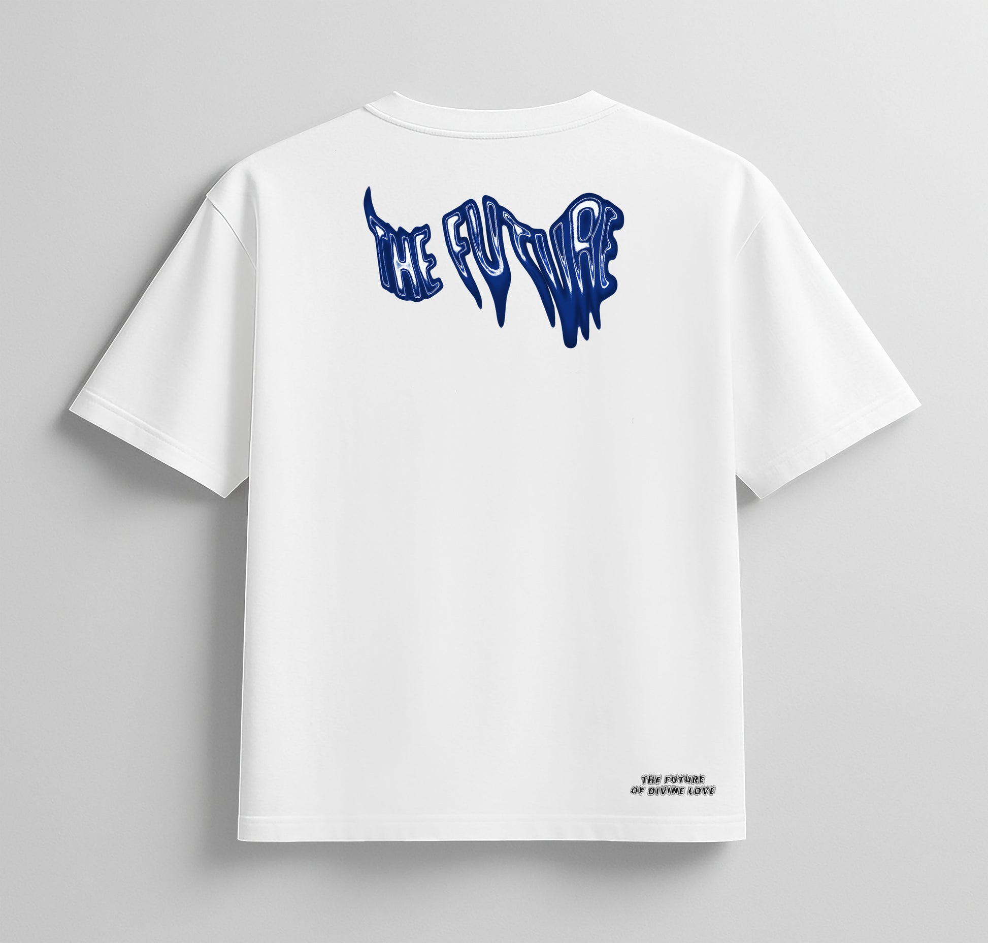 Oversized graphic tee featuring the blue floating silhouette artwork. Mid weight cotton, soft feel, and signature THE FUTURE back print. Model wears a size L in the lookbook images and a size S in the studio product shot.
