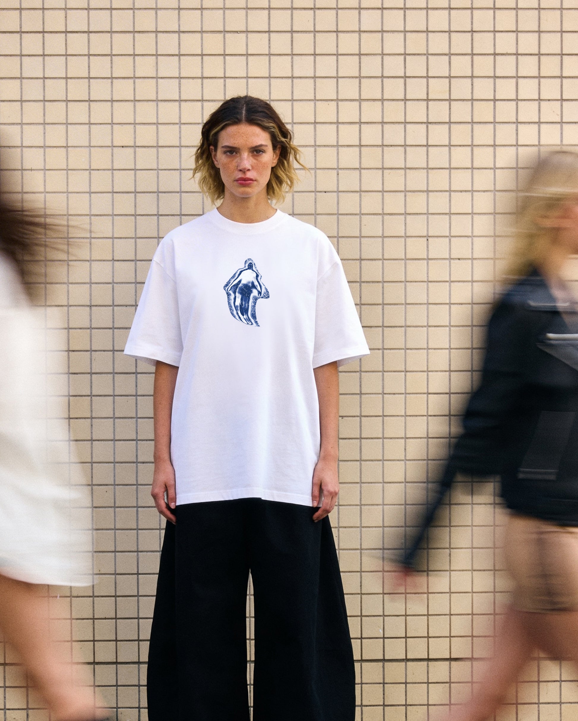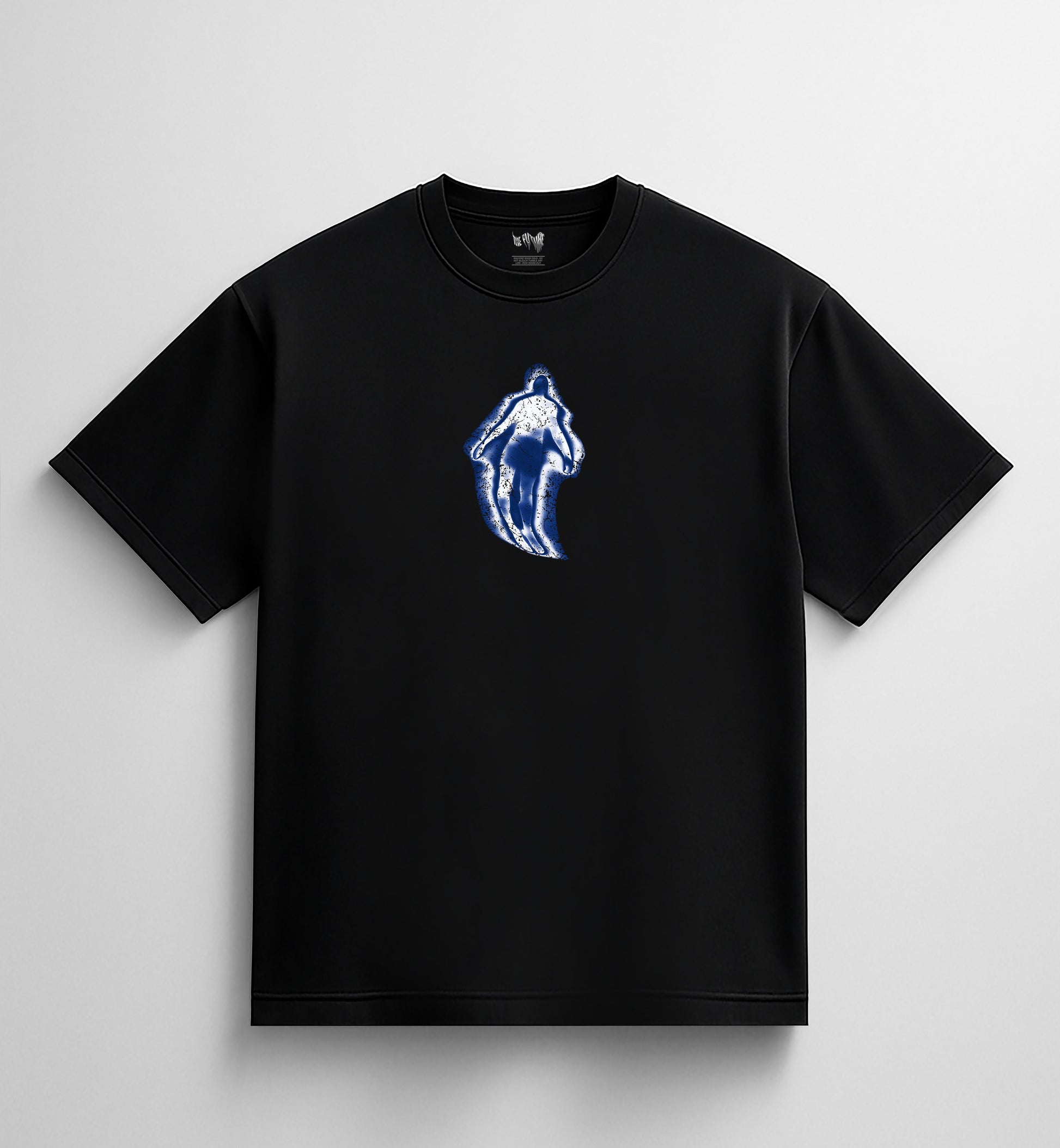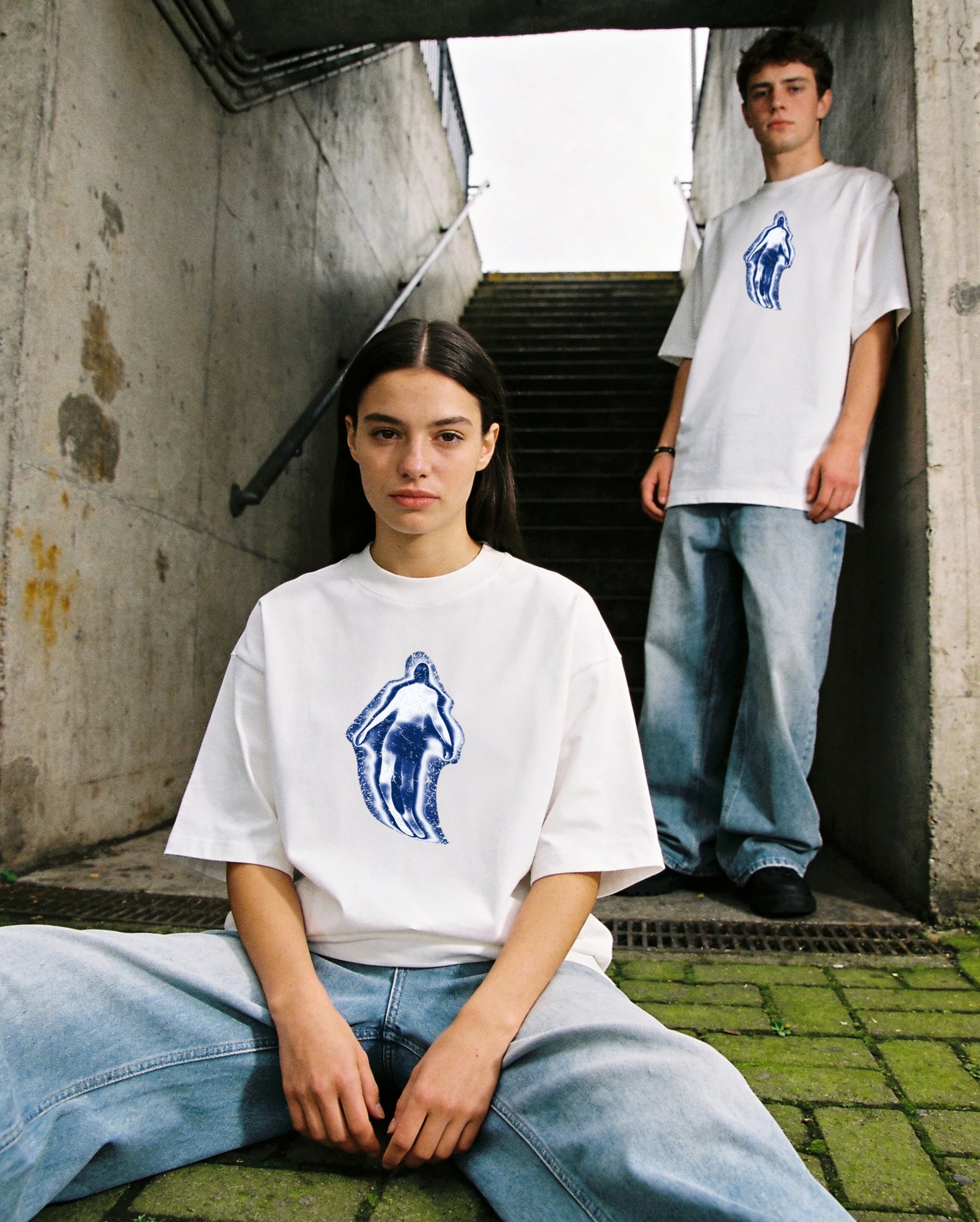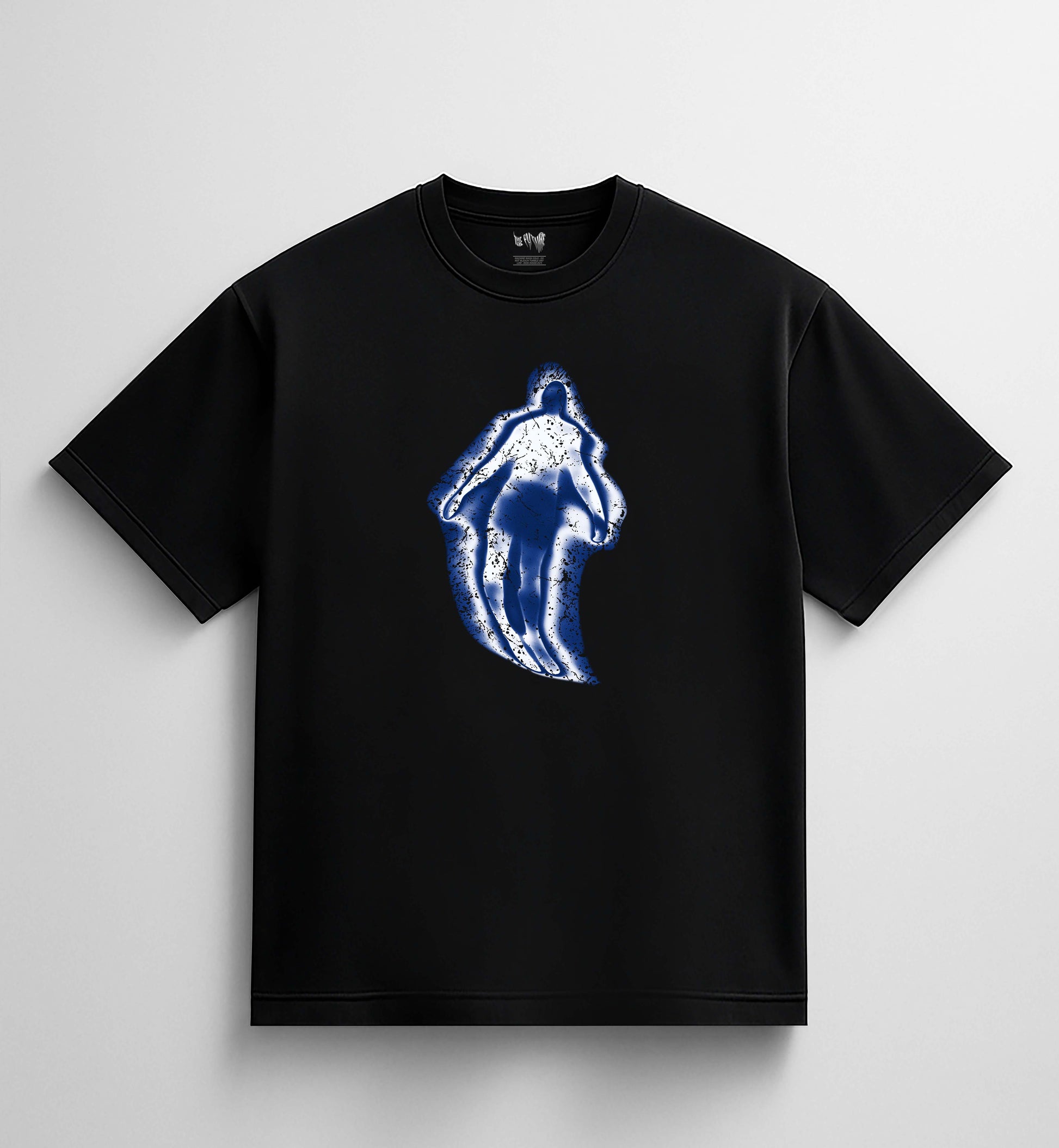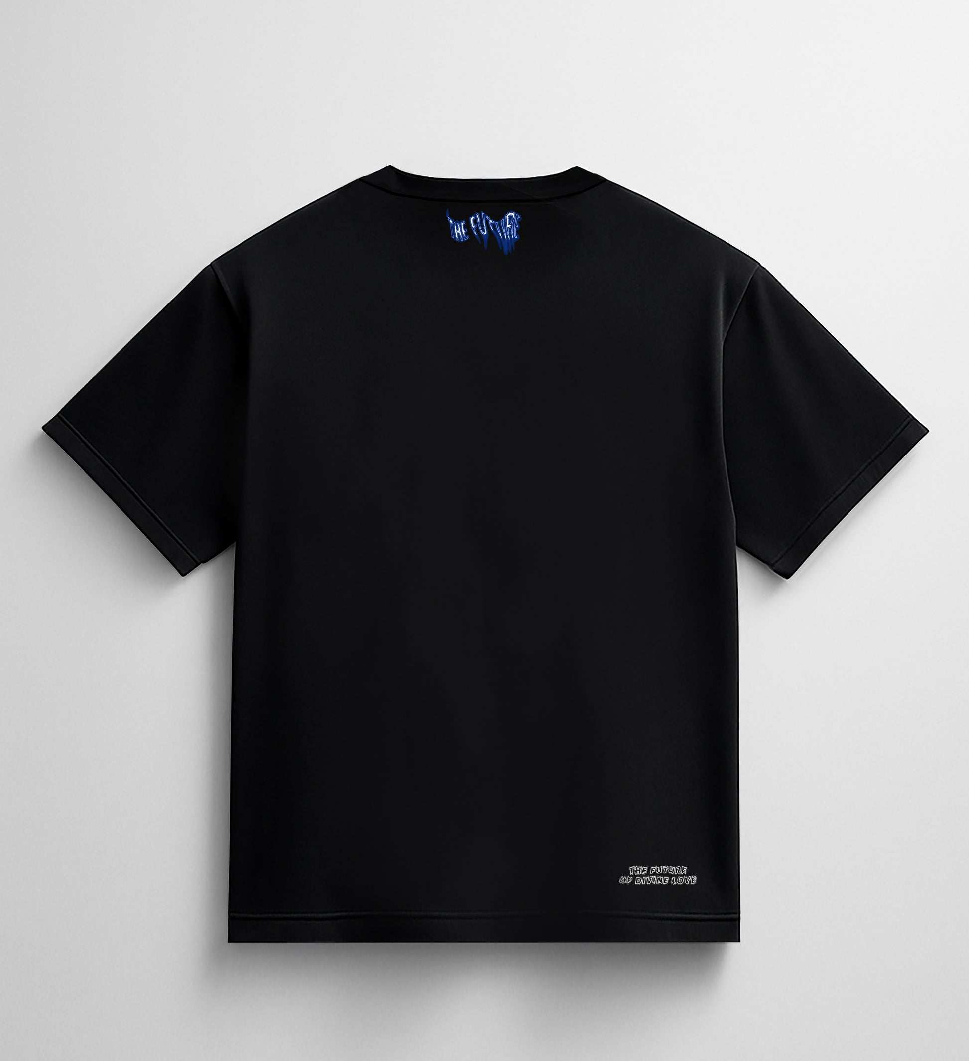 Oversized graphic tee featuring the blue floating silhouette artwork. Mid weight cotton, soft feel, and signature THE FUTURE back print. Model wears a size L in the lookbook images and a size S in the studio product shot.